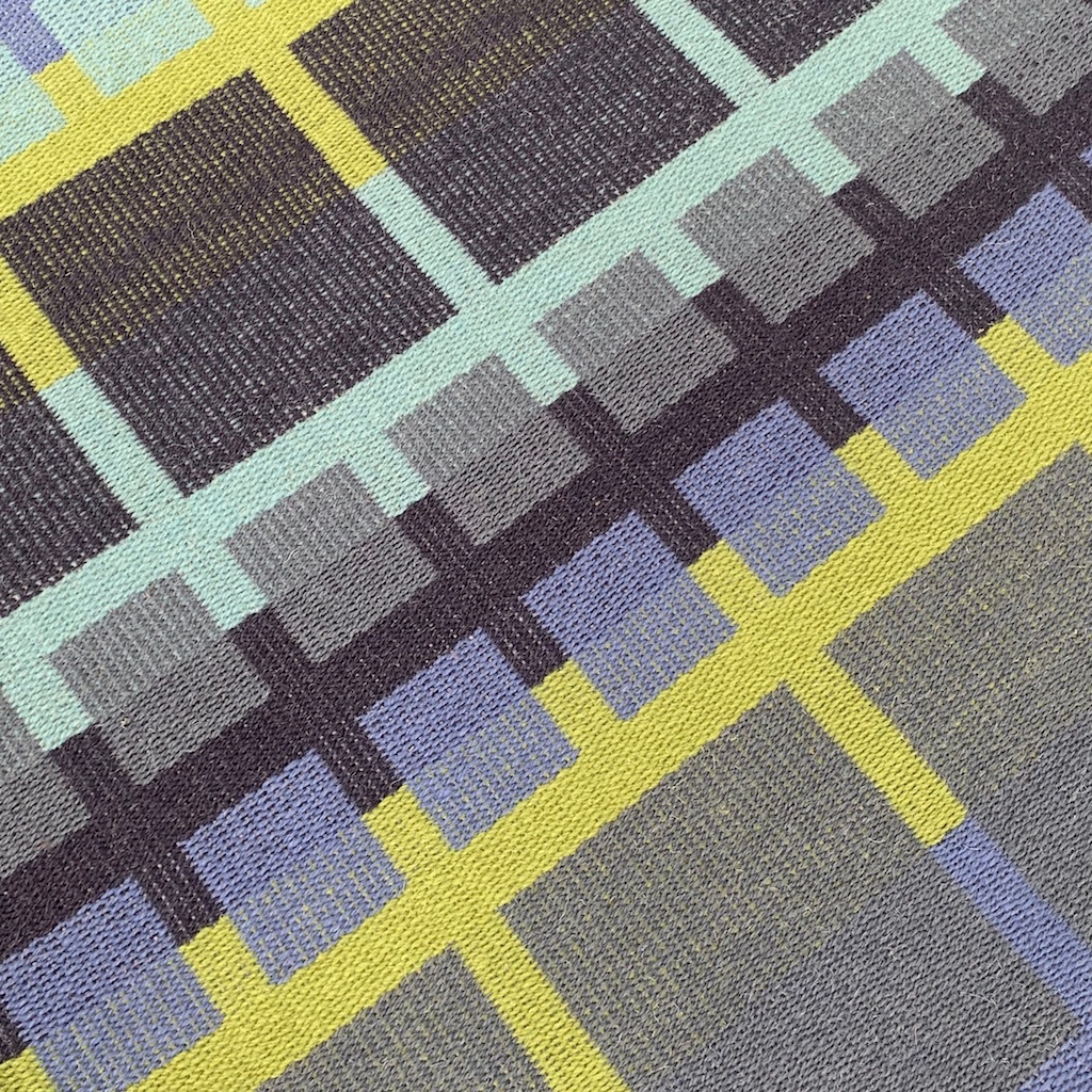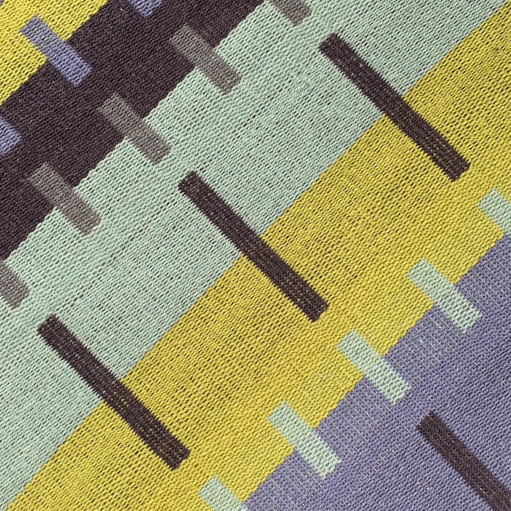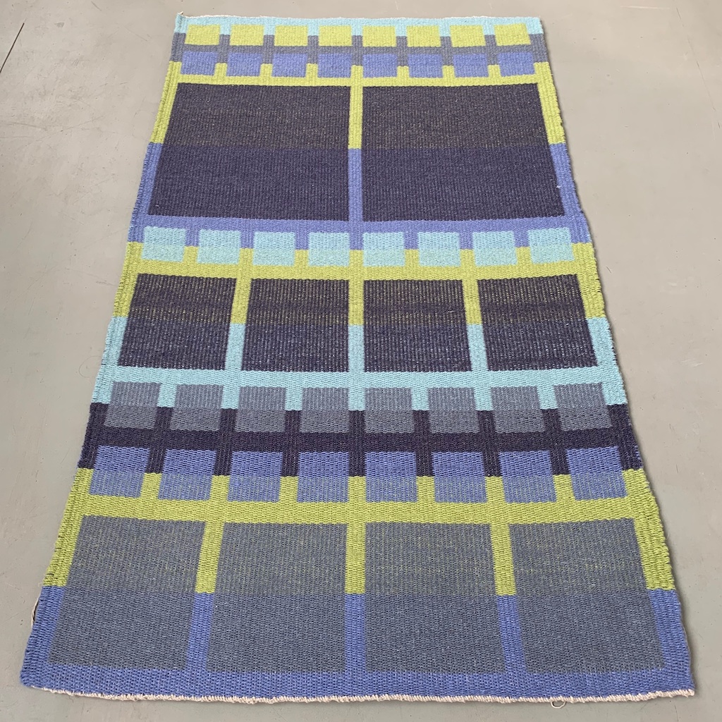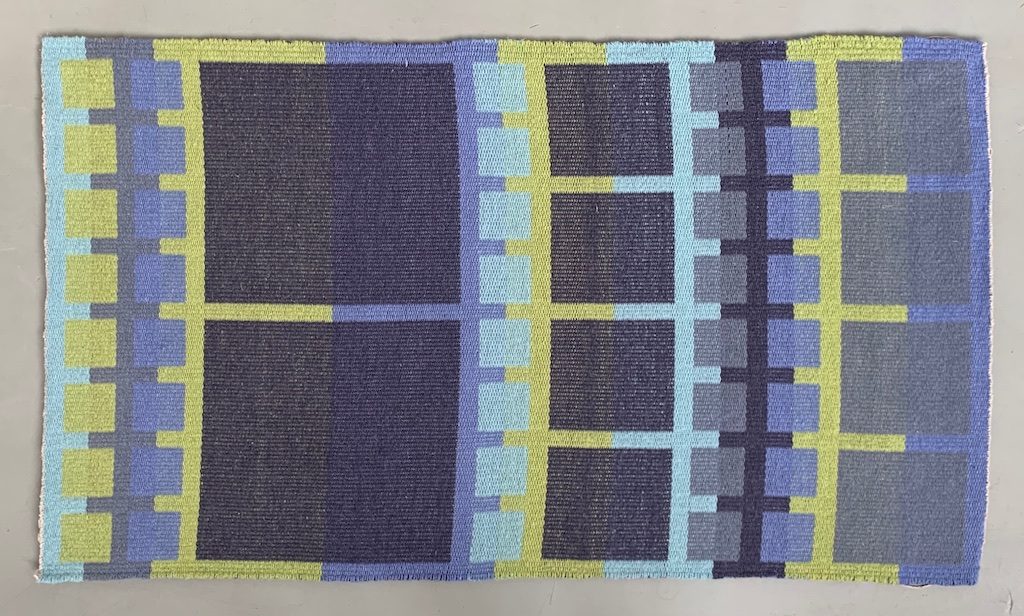 De kunst is de goede balans te vinden tussen schering en de twee kleuren van de inslagdraden. Dat is nog niet helemaal gelukt. De contrasten van de kleuren hebben andere impact dan ik vooraf dacht. Ontwerpen voor deze schaal (90 cm x 135 cm) is andere koek.