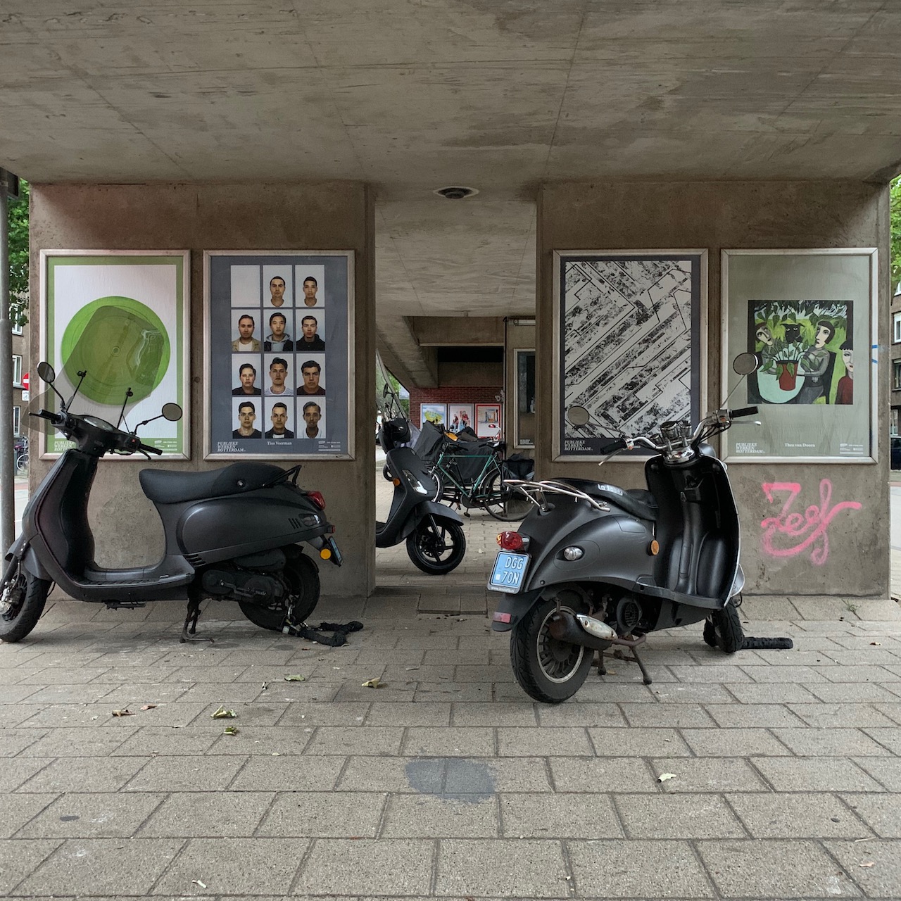 Hij is tot 9 augustus te bewonderen onder het viaduct Schieweg / Talmastraat in Rotterdam Noord. Het is tof om het werk in de openbare ruimte te zien. Stoer beton erachter. Lekker rimpelend gelijmd, waarbij een nieuwe papierstructuur ontstaat. En als er geen mensenpubliek is, dan zijn er altijd wel een paar scooters of moteren die zich laven aan de kunst.