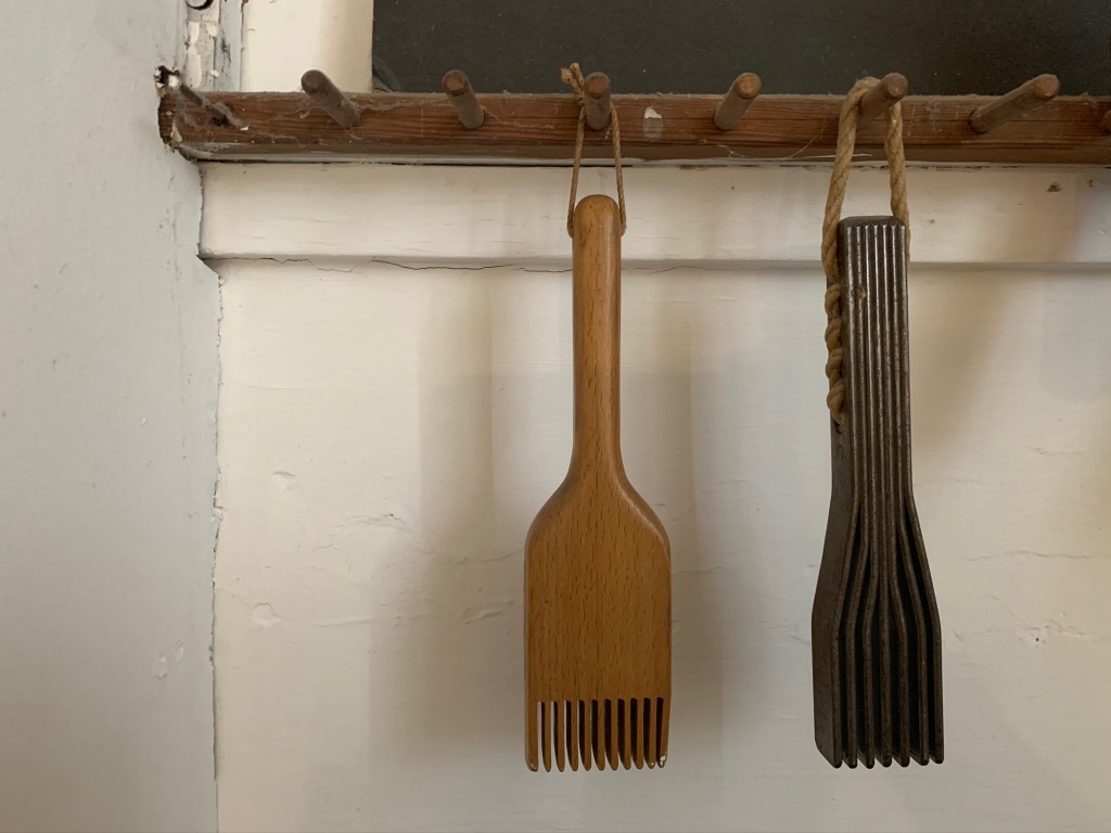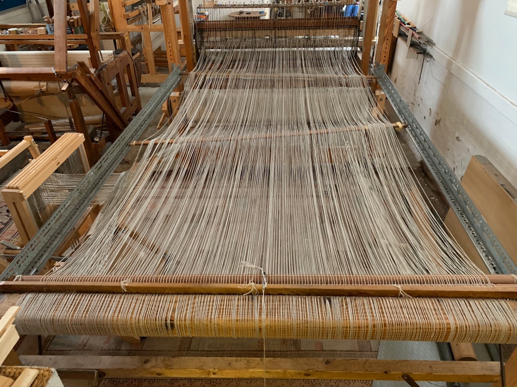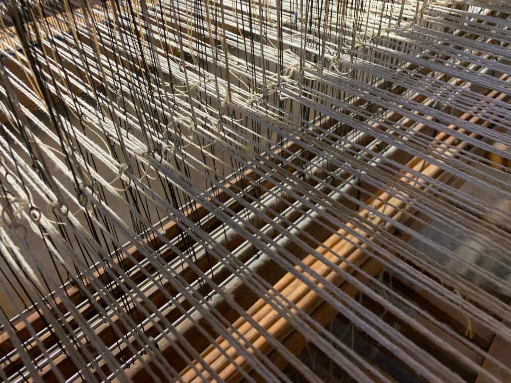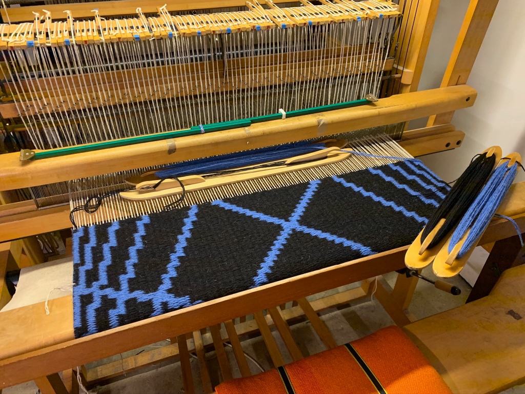De tweede week in Nayland heb ik een vooraf ontworpen vloerkleed geweven. Op een bijzonder getouw. Peter Collingwood (de vader van Jason) ontwikkelde een systeem voor schachtwisseling. Met dit systeem kun je tijdens het weven per inslag bepalen hoe de blokken in een blokweefsel worden geplaatst. Wanneer je verandering wilt, dan haal je de hendels over die boven de schachten zijn geplaatst.