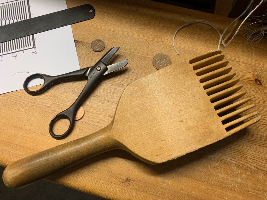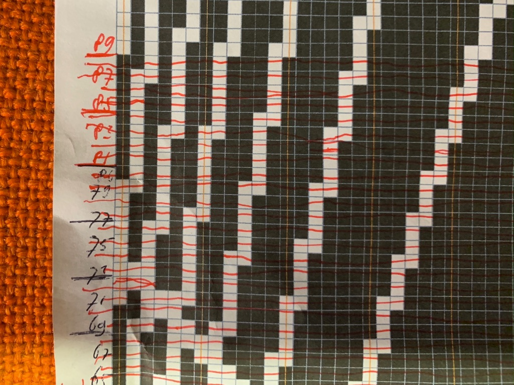 Het ontwerp is vooraf uitgewerkt op ruitjespapier (93 pixels breed, 201 pixels hoog). Opperste concentratie om op het juiste moment de juiste hendels te wisselen, steeds de goede trapper in te trappen, consequent de breedtehouder mee te bewegen, zo regelmatig mogelijk de draad ruimte te geven en de slagboom aan te slaan, en de twee steeklatten zo te manipuleren dat de zoom mooi wordt (onder wevers gelden perfect selvedges als visitekaartje). Na verloop van tijd lukte het goed om mijn ritme te vinden.