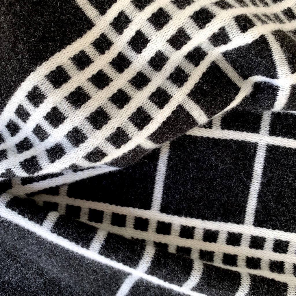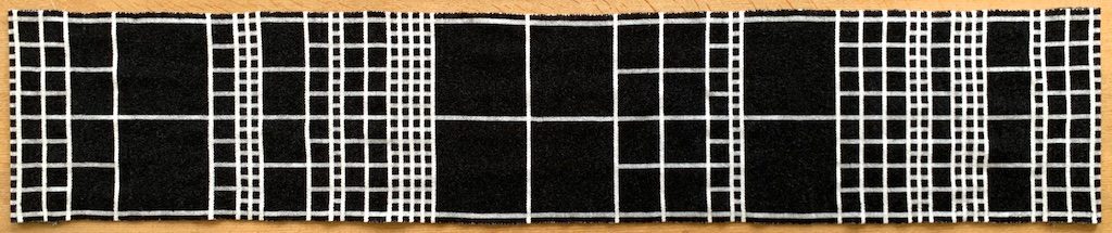 Twee wollen dassen op dezelfde schering. De schering zelf is niet zichtbaar, maar de manier waarop deze op het getouw is ingericht bepaalt wel de mogelijkheden voor het patroon.